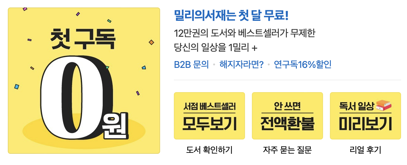현재 밀리의 서재는 구독 첫 가입시 첫 달 무료 혜택을 주고 있습니다. 관심이 있으신 분들은 지금 바로 신청하셔서 첫 달 무료 혜택을 누려보시면 좋을 것 같습니다.